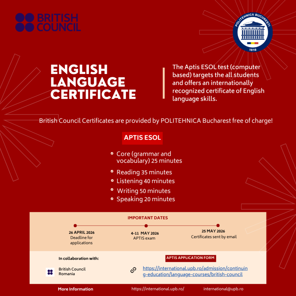 Students of POLITEHNICA Bucharest have the opportunity to take the Aptis ESOL test free of charge, organized in collaboration with British Council Romania, and obtain an international English language certificate.