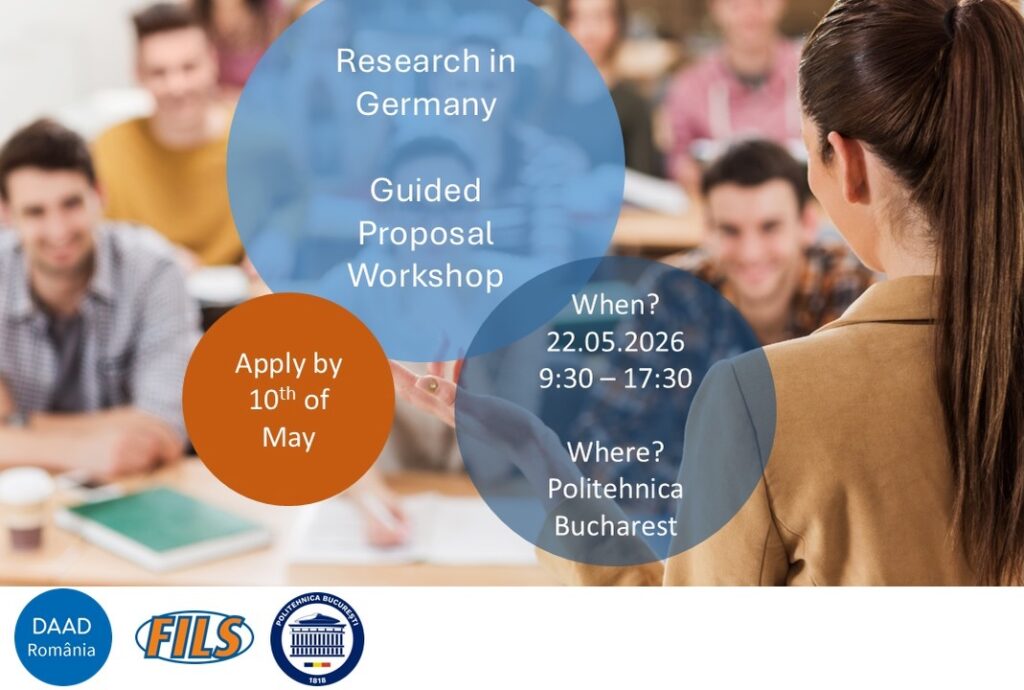 Le DAAD Roumanie organise l’atelier « Guided Proposal Workshop » le 22 mai 2026, entre 9h30 et 17h30, destiné aux étudiants en master et en doctorat intéressés par la rédaction d’une proposition de recherche.