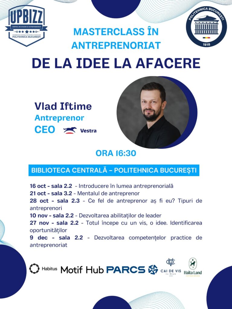 Masterclass de Antreprenoriat „De la idee la afacere” susținut de Vlad Iftime, Antreprenor & CEO Vestra Industry este dedicat studenților Universității Naționale de Știință și Tehnologie POLITEHNICA București, interesați să descopere etapele esențiale în transformarea unei idei într-un proiect antreprenorial concret.