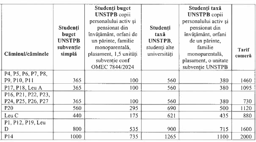 - cazare cu supliment pentru confort (vezi anunț complet), în căminele: Leu D, P12, P19 426 lei/loc/lună, P14 626 lei/loc/lună și P20 186 lei/loc/lună